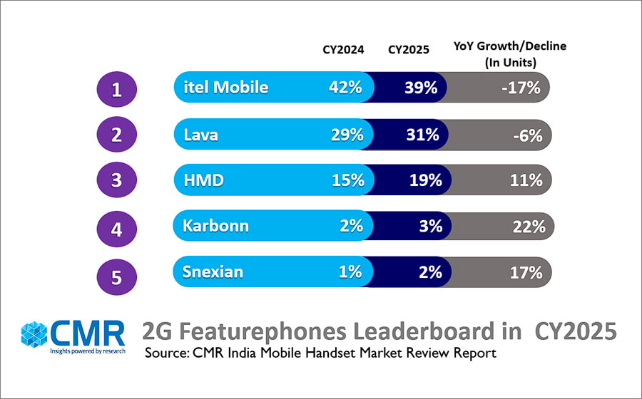 The feature phone market continued to decline, with 2G feature phones down 12% YoY and 4G feature phones down 48% YoY. The 2G segment remained led by Itel (39%), Lava (31%), and HMD (19%), though shipment volumes for leading players declined amid intensifying competition.