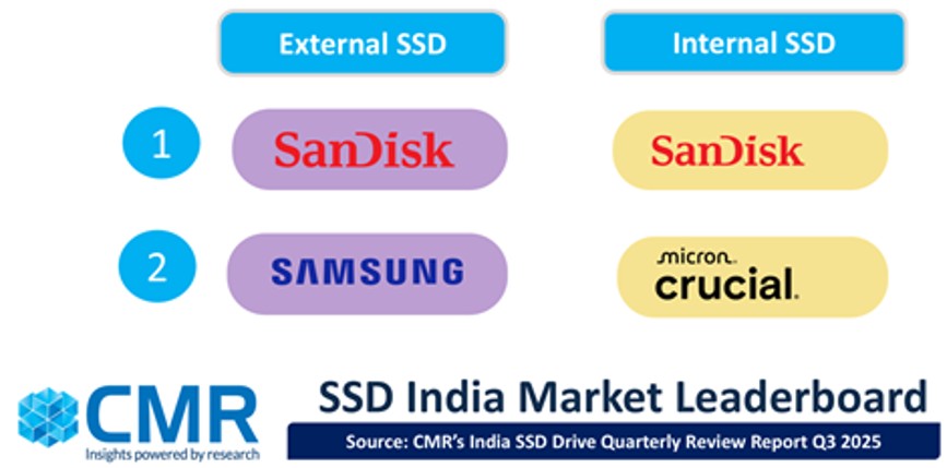 Gurugram/New Delhi, December 05, 2025. According to the CMR India Consumer SSD Market Review Report for Q3 2025, the India internal SSD market recorded a 1% QoQ growth and 48% Growth YoY in shipments. external SSD shipments surge by 52% YoY in the same period.