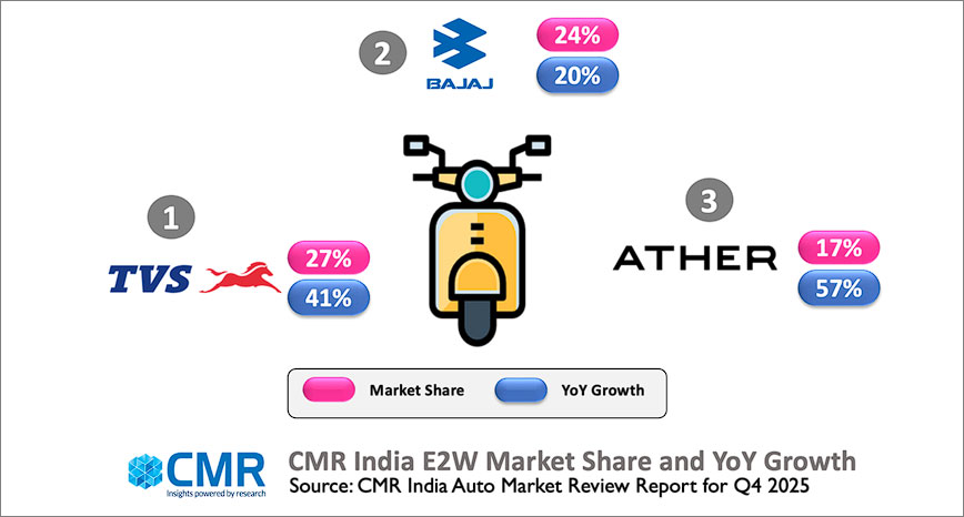 Delhi/Gurugram, 27 Feb 2026: India’s Electric Two-Wheeler (E2W) market maintained its upward trajectory, growing 17% year-on-year (YoY) in Q4 2025, according to CyberMedia Research (CMR) in its latest CMR India Electric Two-Wheeler Market Review Report for Q4 2025. The growth in the E2W segment was supported by government incentives, improving affordability, and rising consumer preference for digitally enabled mobility solutions. Urban demand remained a key growth driver, aided by favourable financing options and festive-season purchase cycles.