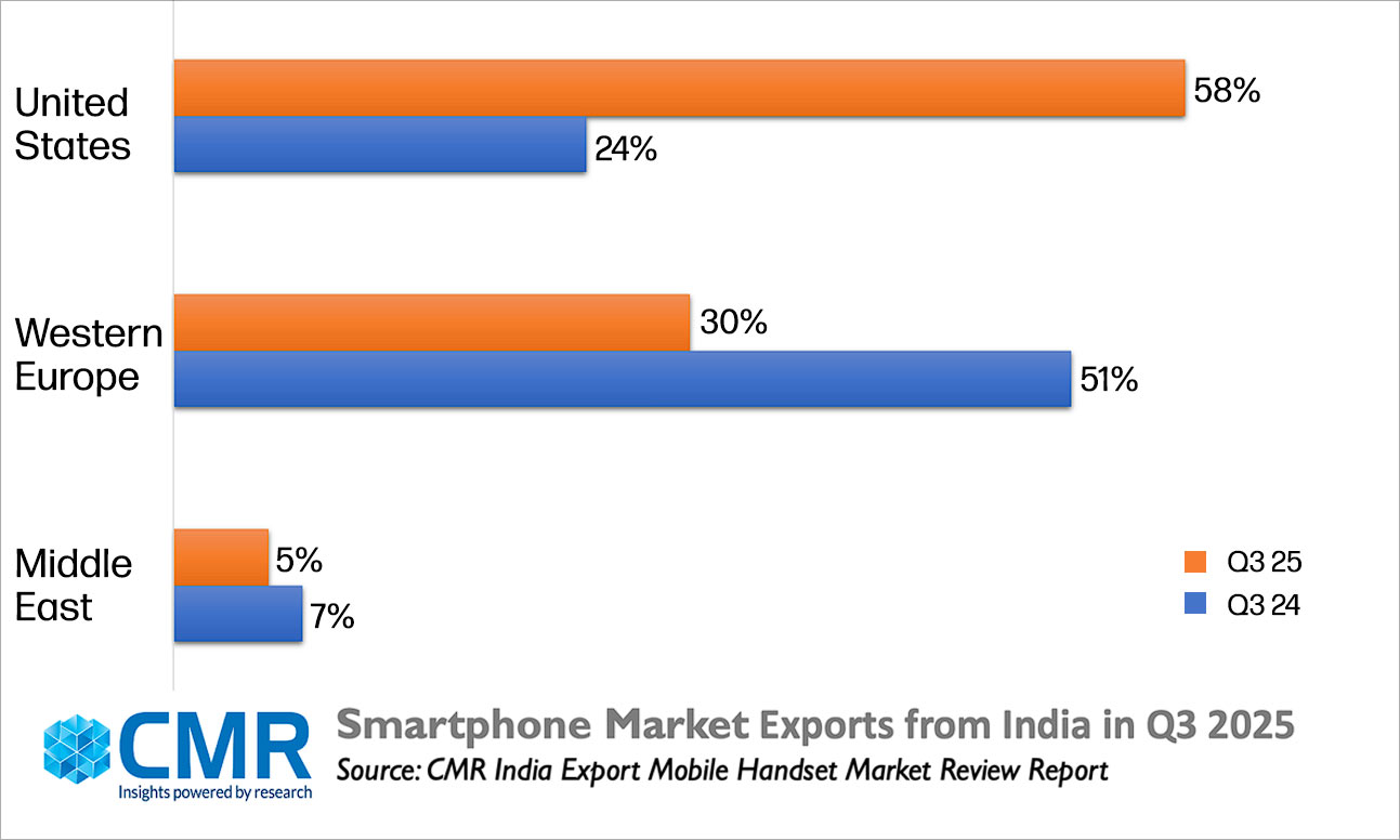 - U.S. drives triple-digit growth in India-made smartphone shipments while Europe and Middle East see demand normalization